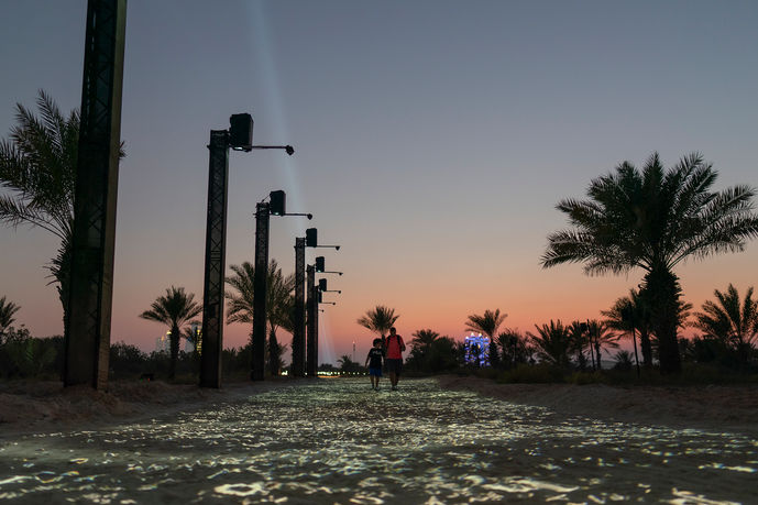 Translation Island (L'île de la traduction) se compose de dix œuvres d'art audiovisuelles, dont six en première mondiale, qui transforment Lulu Island, une île déserte située juste en face du centre-ville d'Abu Dhabi. Les visiteurs sont invités à interagir avec les œuvres d'art en parcourant un chemin de 2 km à l'intérieur de l'île, le long de dunes de sable, de la flore du désert, de plages et de lacs d'eau douce. Les installations présentées utilisent des technologies telles que l'IA, la vision par ordinateur, les capteurs environnementaux et la cartographie en 3D pour créer des expériences poétiques partagées dans un paysage désertique. "Collider", par exemple, détecte les rayonnements cosmiques invisibles qui arrivent sur Terre en provenance des étoiles et des trous noirs, les traduit et les rend visibles sous la forme de légères ondulations le long d'un colossal rideau de lumière visible dans un rayon de 10 km. D'autres œuvres telles que "Dune Ringers" et "Pulse Island" rendent tangibles nos propres signatures biométriques. Plusieurs installations sont des traductions littéralement vivantes de la langue. "Translation Stream" est un flux fluide de lettres, projetées sur le sentier de sable, qui s'organisent autour des visiteurs, révélant la poésie de poètes émiratis contemporains en anglais et en arabe. Parallèlement, "Shadow Tuner" permet aux visiteurs d'utiliser leur ombre pour syntoniser jusqu'à 12 000 flux radiophoniques en direct du monde entier, et "Translation Lake" utilise des avatars vocaux d'IA pour traduire sans fin le chef-d'œuvre réconditoire de James Joyce, "Finnegan's Wake", en 24 langues, célébrant l'impossibilité et l'absurdité de la traduction automatique fluide d'une littérature humaine complexe.